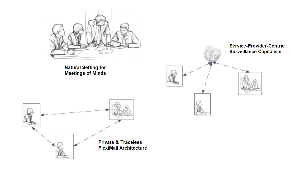 Prior to telecommunication advancements, privacy was a given. The proliferation of the Internet and mobile phones escalated data collection, paving the way for Surveillance Capitalism. This led to a marketplace of service providers engaging in data-driven surveillance, ultimately forming a global network where personal information became a commodity, transforming the landscape of personal privacy. Now, we've come full circle. Built upon the PlexiMail architecture, we can once again restore the natural setting for private and invisible social interaction, amidst the looming backdrop of a blockchain smart contract and Web3Storage structured as utility services, with only the faceless delivery notifications being passed around. The bulk of the cost is carried by individual users for their Web3Storage subscription, which is free if subscribing to less than 5GB. This also demonstrates the cost advantages of a true distributed service infrastructure that inherently repels surveillance.
