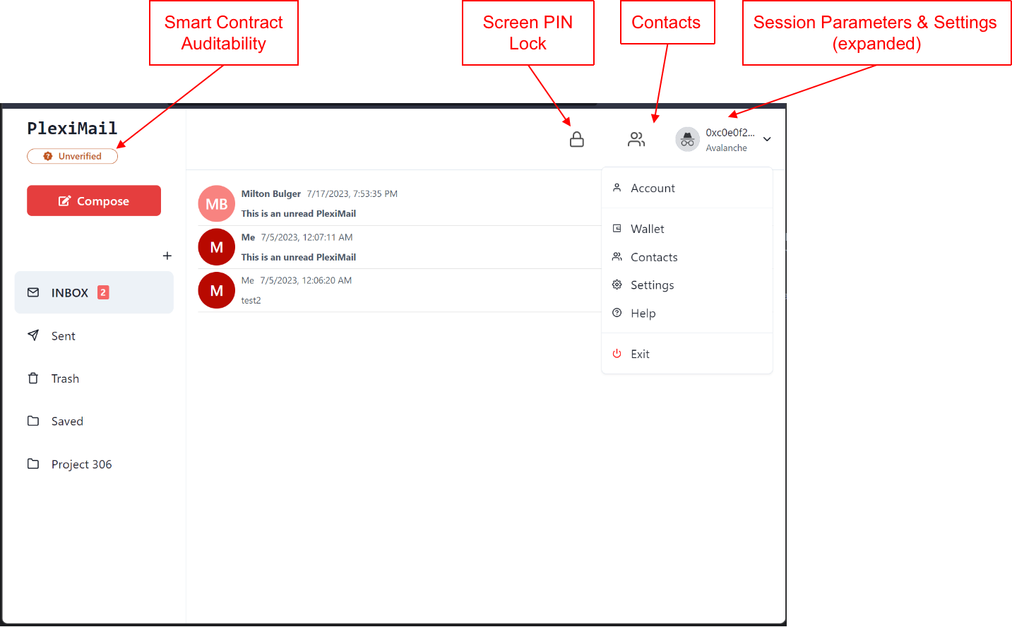 PlexiMail Address: Your PlexiMail addresses are created from your Avalanche accounts, jointly managed with a built-in crypto wallet or PlexiMail Wallet. Your PlexiMail Address can also be "published and registered" with the PlexiMail infrastructure by executing a smart contract built into the Avalanche blockchain or other supported blockchains.
